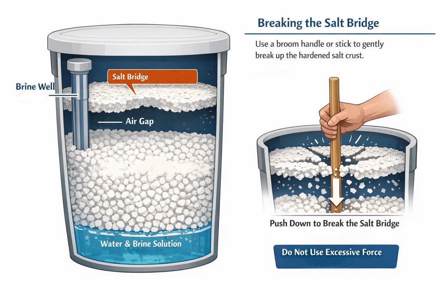 Watch Out for "Salt Bridges": In humid Texas weather, salt can sometimes form a hard crust at the top of the tank, creating an empty hollow space underneath. This is called a "salt bridge." Even if the tank looks full, the salt isn't touching the water. If your water suddenly feels "hard," use a broom handle to gently poke the salt and break up any crust.